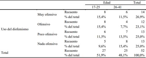 La tabla 4 muestra las diferencias del uso del disfemismo según edad en número de estudiantes y el porcentaje de apreciación en diferentes niveles. Se observa que del 100% de estudiantes encuestados, el 51,9% están en el rango de 17-25 años y 48,1% en el rango de 26- 41 años.