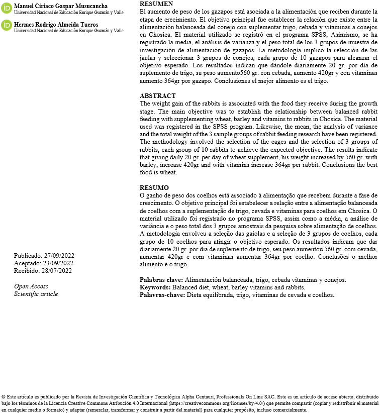 [3] Chisag, L. (2016). Comportamiento productivo y rendimiento a la canal en conejos alimentados con forrajes arbóreos. Tesis. Universidad técnica de Ambato facultad de ciencias Agropecuarias Carrera de Medicina Veterinaria y Zootecnia Ambato – Tungurahua – Ecuador.