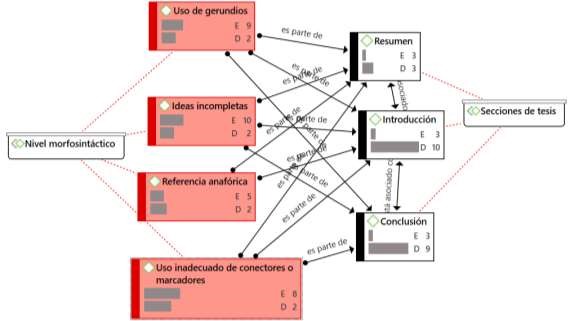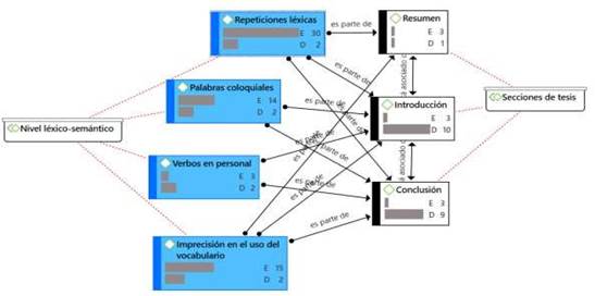 En esta sección se presentan los datos analizados correspondientes a las categorías planteadas para esta investigación. En este sentido, se ha considerado las tesis en las secciones de introducción, resumen y conclusiones, las cuales en conjunto conforman una de las variables a analizar. Con las mismas unidades hermenéuticas, se han recabado los datos respecto a la variable de las marcas orales, estas se han desglosado en dos subcategorías: marcas orales a nivel léxico-semántico, incluye las repeticiones léxicas, palabras coloquiales, imprecisión en el uso del vocabulario y los verbos en personal, por otro lado, están las marcas orales a nivel morfosintáctico, donde se incluye el uso de gerundios, uso inadecuado de conectores y marcadores, las referencias anafóricas y las ideas incompletas. El conjunto de estas categorías y subcategorías se han trasladado al programa computacional de análisis de datos Atlas.ti, y han sido codificadas en lista a partir de la matriz de categorización teniendo los siguientes códigos: