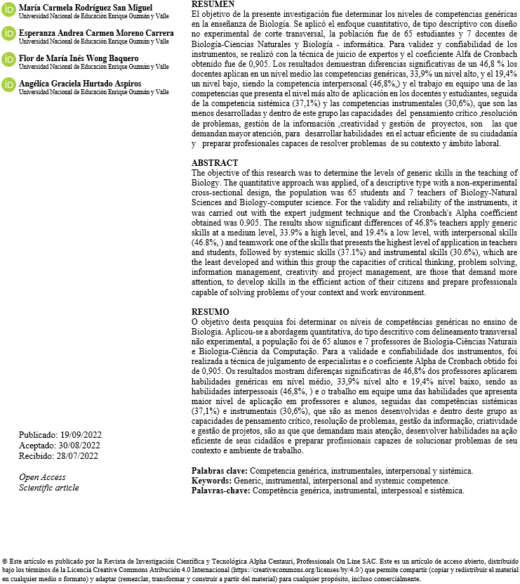 Por la importancia que tienen estas competencias en la forma de actuar de las personas graduadas en su desempeño profesional y ciudadano, se propuso como objetivo determinar los niveles de competencias genéricas en la enseñanza de Biología. Se elaboró una encuesta y entrevista para identificar nueve competencias genéricas seleccionadas del Tuning Latinoamérica, que consideramos que un estudiante egresado debe poseer para una sociedad del siglo XXI.