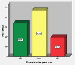 De los encuestados, el 46,8% (29) tienen competencias genéricas de nivel medio, seguido por un 33,9% (21) quienes tienen un nivel alto, y el 19,4% (12) un nivel bajo.