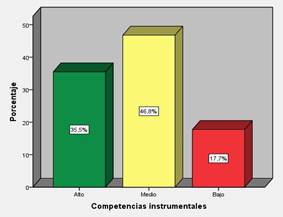 De los encuestados, el 46,8% (29) tienen competencias instrumentales de nivel medio, seguido por un 35,5% (22) quienes tienen un nivel alto, y el 17,7% (11) un nivel bajo.