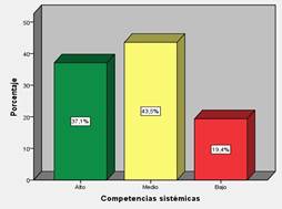 De los encuestados, el 43,5% (27) tienen competencias sistémicas de nivel medio, seguido por un 37,1% (23) quienes tienen un nivel alto, y el 19,4% (12) un nivel bajo.