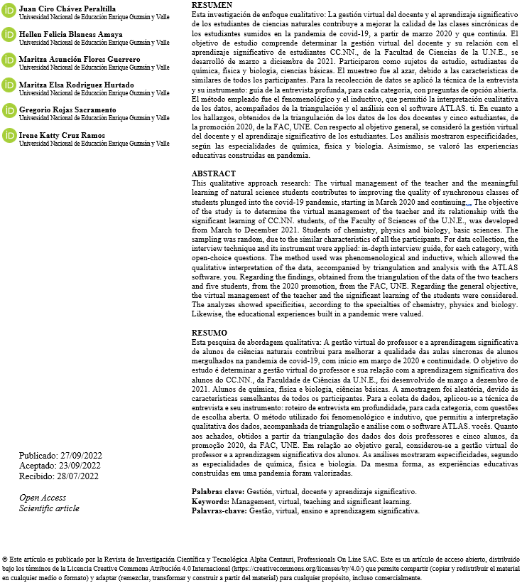 Este estudio tuvo como objetivo determinar de qué manera se cumplía la gestión pedagógica virtual del docente universitario, en el aprendizaje significativo de los estudiantes de la facultad de ciencias específicamente en biología, física y química, tanto en las clases sincrónicas como asincrónicas. El enfoque utilizado en esta investigación, fue el cualitativo, de tal manera, que permitiera como dice Hernández et al. (2014) utilizar “la recolección y análisis de datos para afinar las preguntas de investigación o revelar nievas interrogantes en el proceso de interpretación” (p. 7). Asimismo, se orienta por temas o categorías o temas significativos que se relacionan o desprenden de las categorías de investigación. Se desarrolló de marzo a diciembre del 2021. Participaron estudiantes y docentes, seleccionados al azar. Se utilizó el método inductivo, que permitió la recolección de los datos informativos de las experiencias y emociones de los sujetos de estudio, a través de la técnica de la entrevista profunda para lo que se emplea la guía de la entrevista como instrumento. Para el análisis e interpretación de la información se recurrió al método fenomenológico, que permitió cumplir las cuatro fases de la investigación: 1° Fase, reflexiva; 2° Fase, trabajo de campo; 3° Fase, analítica y 4° Fase, informática, según como recomienda Rodríguez et al. (1999, p. 79). El diseño de esta investigación corresponde al enfoque cualitativo, según los parámetros del método, tipo fenomenológico inductivo, que se adecúa a los objetivos y metas de las ciencias naturales se parte de los hechos, tal como recomienda Hernández et al. (2014) a través de las fases cíclicos o en espiral de actuar, pensar y observar (p. 468).