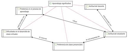 Podemos observar en la figura 3, una red hermenéutica correspondiente a la categoría aprendizaje significativo y sus 5 subcategorías con enlaces entre sí, dentro de los que más destacan encontramos el enlace de influencia de la subcategoría problemas en el proceso de aprendizaje sobre la subcategoría actitud del estudiante que según lo analizado podemos afirmar que los problemas presentados tienen que ver con la perdida de internet la cual influye en la actitud del estudiante de forma negativa, tenemos otro enlace esta vez de tipo causal entre la subcategoría preferencia de clases presenciales que es el resultado de las dificultades en el desarrollo de las clases virtuales al preferir la mayoría de estudiantes un ambiente presencial.