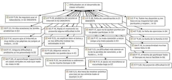 Red hermenéutica con respecto a la subcategoría dificultades en el desarrollo de clases virtuales