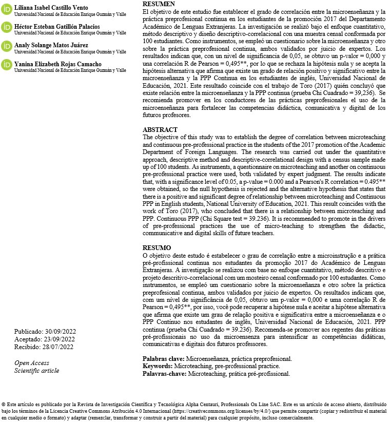 Gracias a los antecedentes mencionados, se puede apreciar que esta técnica tiene como propósito cambiar y mejorar las habilidades del docente para que deje de ser un simple instructor y transmisor de conocimientos y se convierta en un docente reflexivo y crítico; desarrollando sus aptitudes básicas y reforzando su capacidad de decisión sobre aspectos instructivos a fin de que mejore su práctica docente (factor clave de la calidad educativa). Numerosos estudios en relación a la microenseñanza así lo confirman. Por ejemplo: Onwuagboke (2017) ha señalado la necesidad de un entorno de microenseñanza que permita a los profesores en formación adquirir las habilidades de un trabajo pedagógico eficaz en un ambiente controlado de laboratorio. Los hallazgos de su estudio revelaron que las intervenciones de microenseñanza mejoraron significativamente las habilidades de enseñanza de los participantes. Por su parte Watson (2007) manifiesta que la experiencia de microenseñanza en la UPC se desarrolla como parte del proceso de inducción que el departamento de calidad educativa brinda a los profesores nuevos identificando su nivel de competencia; por ejemplo, “se comunica en forma efectiva involucrando a los alumnos en el tema desarrollado” y “elabora y utiliza materiales de enseñanza-aprendizaje haciendo un uso efectivo de la tecnología educativa y de las TICs”. La autora presentó los resultados del análisis de las habilidades docentes en las microenseñanzas realizadas en el ciclo 2006-02, algunas de los cuales fueron: 1: La mayoría de los docentes nuevos utiliza lenguaje verbal y no verbal para comunicarse efectivamente; y en general, presenta habilidades básicas de comunicación las cuales les permiten realizar una clase fluida, con buena dicción, etc. y 2. Hay que seguir trabajando lo referente al uso de los recursos tecnológicos. Así también Bernal y Cordero (2013) proponen a la microenseñanza como una herramienta para el mejoramiento de las habilidades de enseñanza. Seguidamente, mencionamos a Álvarez (2011) quien manifiesta que la formación basada en competencias requiere de profesionales de alta calidad, por lo cual presenta una propuesta de perfil del docente basado en el enfoque por competencias que, entre otras, incluye las capacidades comunicativas (esto es, el uso de diferentes recursos verbales y no verbales para transmitir experiencias y promover aprendizajes en el aula) y también la capacidad tecnológica (relacionadas con el aprendizaje, la investigación, etc.). De igual modo, Jiménez y Rubio (2017) identifican a la competencia comunicativa en inglés como aquella propia de dicha asignatura y que está constituida por la competencia lingüística (estructuras gramaticales), socio lingüística (registros, reglas socio -culturales), discursiva (cohesión y coherencia del texto) y estratégica (elementos verbales y no verbales que apoyan los actos comunicativos) (véase Ronquillo y Goenaga, 2009). Por su parte, Sarrelangue (2020) afirma que el docente, consciente que está interactuando en un mundo globalizado con nativos digitales, ha de poseer habilidades tecnológicas. Por lo cual es esencial la permanente actualización en herramientas y tecnologías digitales ya que apoyan de manera significativa a la microenseñanza. Esto es concordante con lo expresado por Martín, Pérez y Jordano (2020) quienes consideran que para un docente o investigador es esencial ser competente digitalmente en el siglo XXI lo que se traduce en desarrollar su capacidad para manejar plataformas digitales, herramientas colaborativas y herramientas tecnológicas. Con respecto a la práctica preprofesional, para Vera y Jara (2018) esta práctica es el eje que articula todas las actividades curriculares de la formación docente permitiendo la aproximación gradual de los estudiantes al trabajo profesional facilitándoles la internacionalización de su rol como futuros docentes. Al respecto, en la investigación efectuada por Toro (2017) con estudiantes de la especialidad de Tecnología del Vestido en la práctica docente continua, Facultad de Tecnología, Universidad Nacional de Educación Enrique Guzmán y Valle, se concluye que existe relación entre la microenseñanza y la PPP continua (mediante la prueba Chi Cuadrado = 39,236) recomendando una jornada de reflexión para que los docentes reconozcan a la microenseñanza como un instrumento de mejora en la PPP continua. Ahora bien, el tema de las prácticas preprofesionales también se ha correlacionado con temas como la gestión educativa (véase Dextre, 2017) y la calidad de la formación de los estudiantes (véase Mamani, 2017). Por todo ello, en nuestra universidad se optó por la aplicación de la microenseñanza en el desarrollo de las prácticas preprofesionales planteándonos como objetivo general: Establecer el grado de correlación entre la microenseñanza y la práctica preprofesional continua en los estudiantes de la promoción 2017 del Departamento Académico de Lenguas Extranjeras, Universidad Nacional de Educación Enrique Guzmán y Valle, 2021.