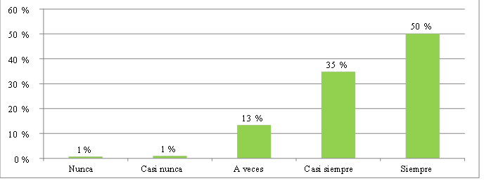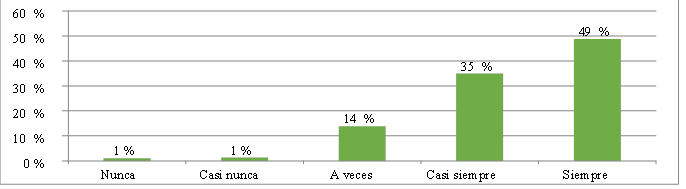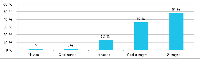 En la figura 5 se puede observar que respecto a la PPP continua el 49% respondió que siempre ha realizado las fases de planeamiento, ejecución y evaluación; seguido del 35% que aseguró que casi siempre; el 14%, a veces; el 1%, casi nunca; y el 1%, nunca; por lo que se puede concluir que la mayoría ha ejecutado las fases mencionadas durante el desarrollo de la práctica preprofesional continua.