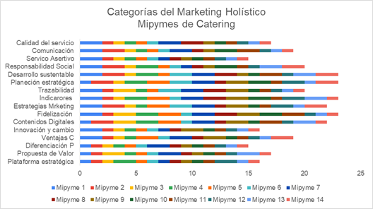 De ahí que la importancia de esta investigación radique en indagar ¿De qué manera una estrategia empresarial del Marketing Holístico logra potenciar las Mipymes del Sector de los Servicios de Catering en la localidad de Fontibón en Bogotá -Colombia? Su propósito es determinar una estrategia empresarial de MH que permita potenciar estas Mipymes en el sector con el apoyo de un enfoque cuantitativo, bajo un estudio descriptivo correlacional y un diseño no experimenta con una encuesta cerrada realizada a 14 empresas bajo las categorías integrales del MH en el sector de Catering de la localidad con influencia directa con la empresa objeto de estudio “Postre y Refrigerios”. De igual forma, se aplica la matriz de factores internos y externos (MEFI) / (MEFE) que facilita el análisis del contexto de la organización identificando tanto las fortalezas como debilidades existentes en las áreas de la empresa “Postres y Refrigerios”, acompañada de la técnica de Brief desde el MH como aporte a la estrategia empresarial esperada, siendo el objeto de estudio.