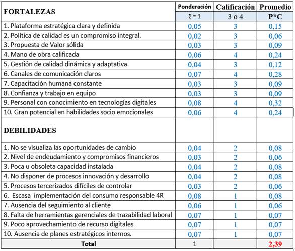 Para David (2013), Los totales ponderados muy por debajo de 2.5 caracterizan a las organizaciones que son débiles en lo interno, mientras que las calificaciones muy por encima de 2.5 indican una posición interna de fuerza. Después de haber sido estructuradas las matrices de factores internos en la actividad del sector de catering en la empresa “Postres y Refrigerios”, fueron calculados los valores ponderados, para cada uno de loas factores calificados obteniendo un valor 2,39. Lo que indica en cada una de ellas que las fuerzas internas no son favorales para la empresa. Por tanto, se debe establecer una estrategia empresarial para brindar la oportunidad de reforzar las fortalezas, reduciendo al máximo las debilidades.