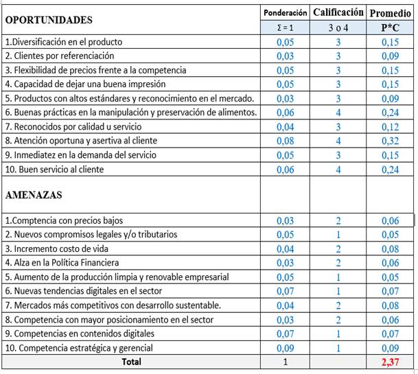 En este caso el peso ponderado total de las actividades del sector de Catering fue de 2,37, lo cual establece que el ambiente externo es favorable a las organizaciones según la información obtenida en la matriz de factores externos.