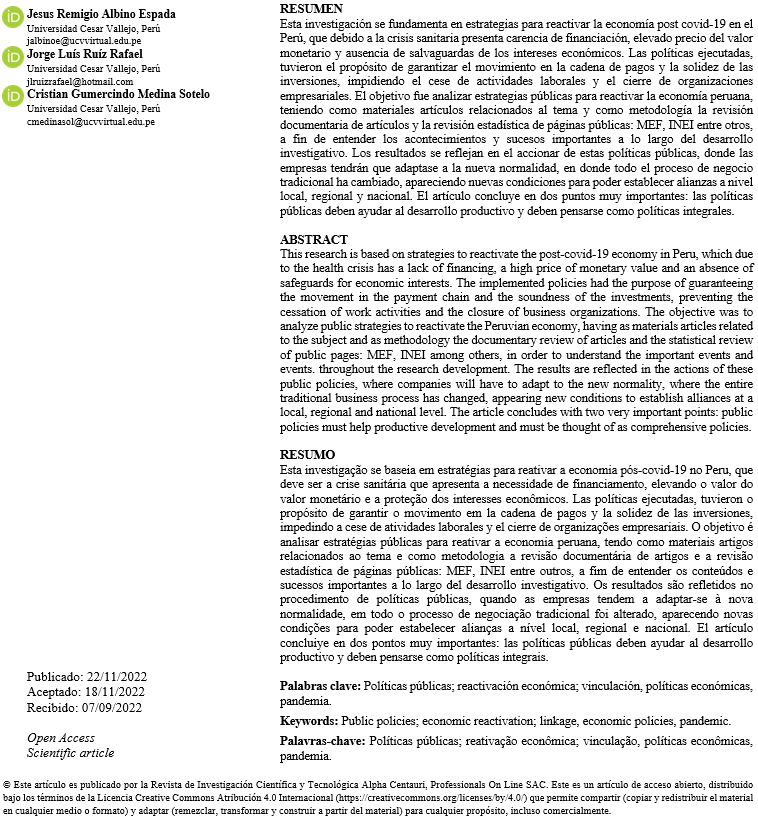 Esta indagación científica corresponde a una revisión de diversos artículos respecto al tema de políticas implementados con el objetivo de buscar la reactivación económica frente a la crisis sanitaria generada por la propagación del corona virus a nivel mundial, comúnmente denominada covid-19 con una visión crítica, este estudio pretende realizar un análisis conceptual de estas estrategias, siendo este es un trabajo fidedigno. La búsqueda de la información científica se desarrolló utilizando diferentes revistas científicas como Scielo, Google académico páginas Web de organismos institucionales como de la OMS u otras instituciones ligadas a la salud y economía, así también se buscó información en el ministerio de salud y economía, tanto de Perú como de otros países de Latinoamérica; siendo las palabras de búsqueda “reactivación económica”, “políticas públicas: reactivación económica” y “desarrollo económico post covid-19”. Se analizaron los estudios cuyo título es similar a nuestra investigación leyendo los respectivos resúmenes, después de depurar los artículos que no tenían que ver con el tema se pasa a leer el artículo por completo para luego realizar una síntesis de la investigación y tomar algunos puntos de referencia para nuestro trabajo. Para escoger dichas investigaciones tienen que tener un mínimo de 5 años y que estos trabajos ayuden a responder nuestro problema de investigación.