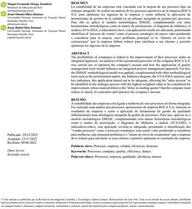 Ahora bien, en cuanto a la aplicación del modelo DMAIC para el análisis de procesos realizado en la empresa ROCA, si bien se encontró una adecuada aplicación para la definición de los procesos estratégicos y luego las acciones de mejora a tener en cuenta, este modelo según lo menciona (De Mast & Lokkerbol, 2012) muestra tener algunas limitaciones en la identificación de problemas, es por ello que para el presente estudio se complementó con otras técnicas como el diagrama de Ishikawa (Wong et al., 2016) para la identificación del problema central a través del análisis de causas y efectos, encontrándose que fue la “demora en envío de cotizaciones” y sobre lo cual se encuentra el desafío para implementar las mejoras.