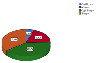 La figura 2, muestra que el 40,35% de estudiantes contestaron Casi Siempre, que es la respuesta mayoritaria, el 35,09 % respondieron Siempre, un 19,30 % respondieron A veces, y un 5,26 respondieron Casi Nunca; por tanto, la variable formación profesional tecnológica en tiempos de pandemia tiene una aceptación regular.